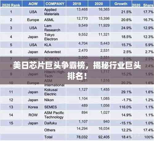 随着科技的飞速发展,芯片行业已成为全球电子产业的核心,在众多芯片公司中,美国和日本的芯片公司因其卓越的技术实力和创新能力备受瞩目,本文将为您详细介绍美日芯片公司的排名。